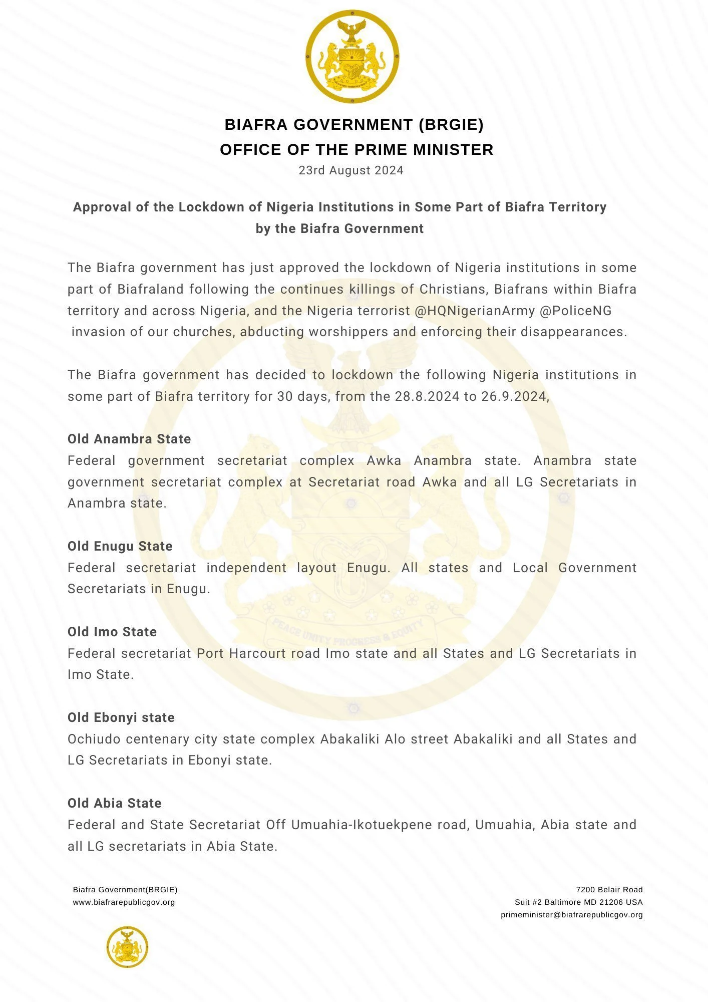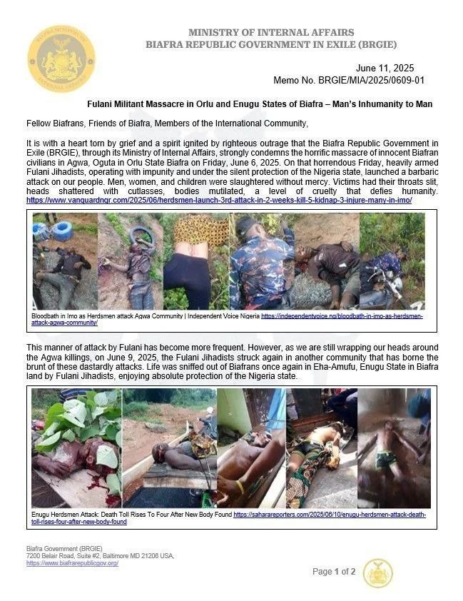 Aniebiet Archibong 10/15/25 Aniebiet Archibong 10/15/25 ‘Christian Genocide in Nigeria by Senator Ted Cruz’ BRGIE Behind this Milestone in the United States of America Congress. Read More Aniebiet Archibong 10/9/25 Aniebiet Archibong 10/9/25 BRGIE Condemns Injustice, Torture, Abuses, Persecution, illegalities, and Tribal Cruelties on Nnamdi Kanu by Nigeria Government Read More Aniebiet Archibong 10/7/25 Aniebiet Archibong 10/7/25 BRGIE’S U.S CONGRESSIONAL BRIEFING ON BIAFRA - CHRISTIANS NOW HAVE HOPE AFTER MANY YEARS OF ISLAMIC JIHAD. Read More Aniebiet Archibong 10/7/25 Aniebiet Archibong 10/7/25 BRGIE First-Ever U.S. Congressional Briefing on Biafra - An Open door to International Recognitions Read More Aniebiet Archibong 10/6/25 Aniebiet Archibong 10/6/25 Christian Killings Surge in Nigeria:International Pressure Mounts, Biafra Communities in Danger Read More Aniebiet Archibong 10/6/25 Aniebiet Archibong 10/6/25 BRGIE LAUDS SENATOR TED CRUZ’S LEGISLATION S.2747 AGAINST NIGERIA GOVT. & OFFICIALS ACT 2025. Read More Aniebiet Archibong 9/22/25 Aniebiet Archibong 9/22/25 U.S. Congressional Briefing on Biafra; BRGIE Urge U.S. to Sanction Nigeria for Kidnapping Mazi Nnamdi Kanu, & Finland for Trans-National Repression on Ekpa Read More Aniebiet Archibong 9/21/25 Aniebiet Archibong 9/21/25 Pause Arms Sales to Nigeria - BRGIE Rallies US Lawmakers in Washington D.C. for Biafra Recognition. Read More Aniebiet Archibong 9/20/25 Aniebiet Archibong 9/20/25 Biafra Independence a Response to Nigeria Genocide of over 60 years. Read More Aniebiet Archibong 9/16/25 Aniebiet Archibong 9/16/25 Michael Rubin a senior fellow at the American Enterprise Institute (AEI) has unveiled that he’ll be part of the U.S. CONGRESSIONAL HEARING ON BIAFRA come 18th september, 2025. Read More Aniebiet Archibong 9/16/25 Aniebiet Archibong 9/16/25 BRGIE Call for Sanctions on Nigeria & Finland,Acting PM Provides Explosive Testimony to U.S. Congress, Urges Release of Kanu & Ekpa. Read More Aniebiet Archibong 9/16/25 Aniebiet Archibong 9/16/25 FINLAND COURT & NIGERIA SCARED OF BIAFRA INDEPENDENCE – SIMON EKPA IS BIAFRA ON GLOBAL STAGE. BRGIE RESPONDS TO FINLAND COURT AGAINST BIAFRA Read More Aniebiet Archibong 9/15/25 Aniebiet Archibong 9/15/25 Congressional Hearing on Biafra With USA Congress 18th September 2025 Read More Aniebiet Archibong 9/15/25 Aniebiet Archibong 9/15/25 BRGIE US Diplomatic Meeting with US Congressman Brian Mast (R-FL),Chairman of the House Foreign Affairs Committee Read More Aniebiet Archibong 9/15/25 Aniebiet Archibong 9/15/25 BRGIE US Diplomatic Meeting with US Congresswoman LaMonica McIver (D-NJ). Read More Aniebiet Archibong 9/15/25 Aniebiet Archibong 9/15/25 BRGIE US Diplomatic Meeting with US State Department official Ambassador Tibor Nagy. Read More isaiah anyaogu 6/13/25 isaiah anyaogu 6/13/25 Biafra CDC Report: Diphtheria Read More isaiah anyaogu 6/13/25 isaiah anyaogu 6/13/25 Fulani Militant Massacre in Orlu and Enugu States of Biafra Read More isaiah anyaogu 3/16/25 isaiah anyaogu 3/16/25 BRGIE Accuses UK, EU of Supporting Ethnic Genocide of Indigenous People of Biafra Read More isaiah anyaogu 8/24/24 isaiah anyaogu 8/24/24 One Month Lockdown Read More Older Posts DOWNLOADABLE FILES News