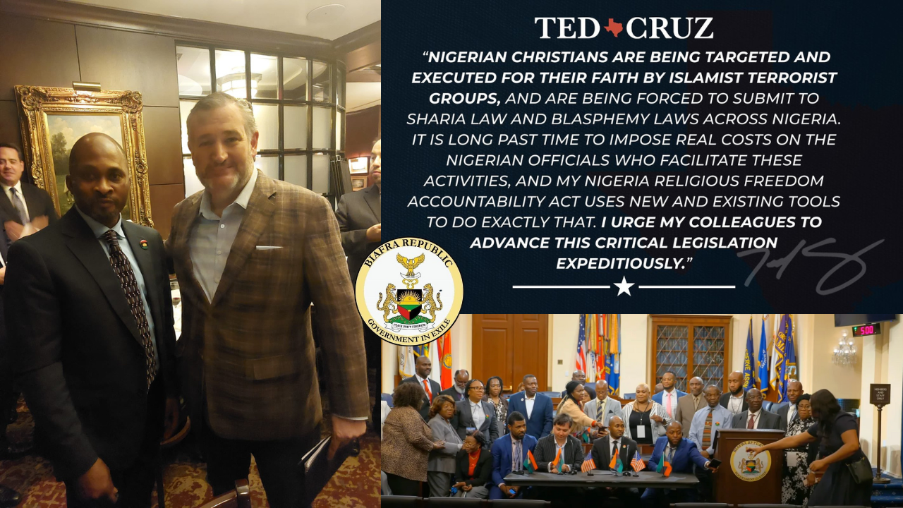 Acting Prime Minister of the Biafra Republic Government in Exile (BRGIE) Ogechukwu Nkere is proud to announce BRGIE's role in being a key behind-the-scene force of the ‘Christian genocide’ narrative in the US Congress. Acting Prime Minister Nkere took over the Biafran independence movement after the incarceration of Simon Ekpa. In particular, Acting Prime Minister Nkere has engaged with Senator Ted Cruz and met him on several occasions to discuss the ‘genocide’ of Christians in Nigeria and Biafra for over the year, and encouraged the Senator and other members of Congress to sanction Nigeria. Senator Ted Cruz introduced legislation S.2747 - Nigeria Religious Freedom Accountability Act of 2025, which would sanction Nigeria and Nigerian officials for their persecution of Christians.